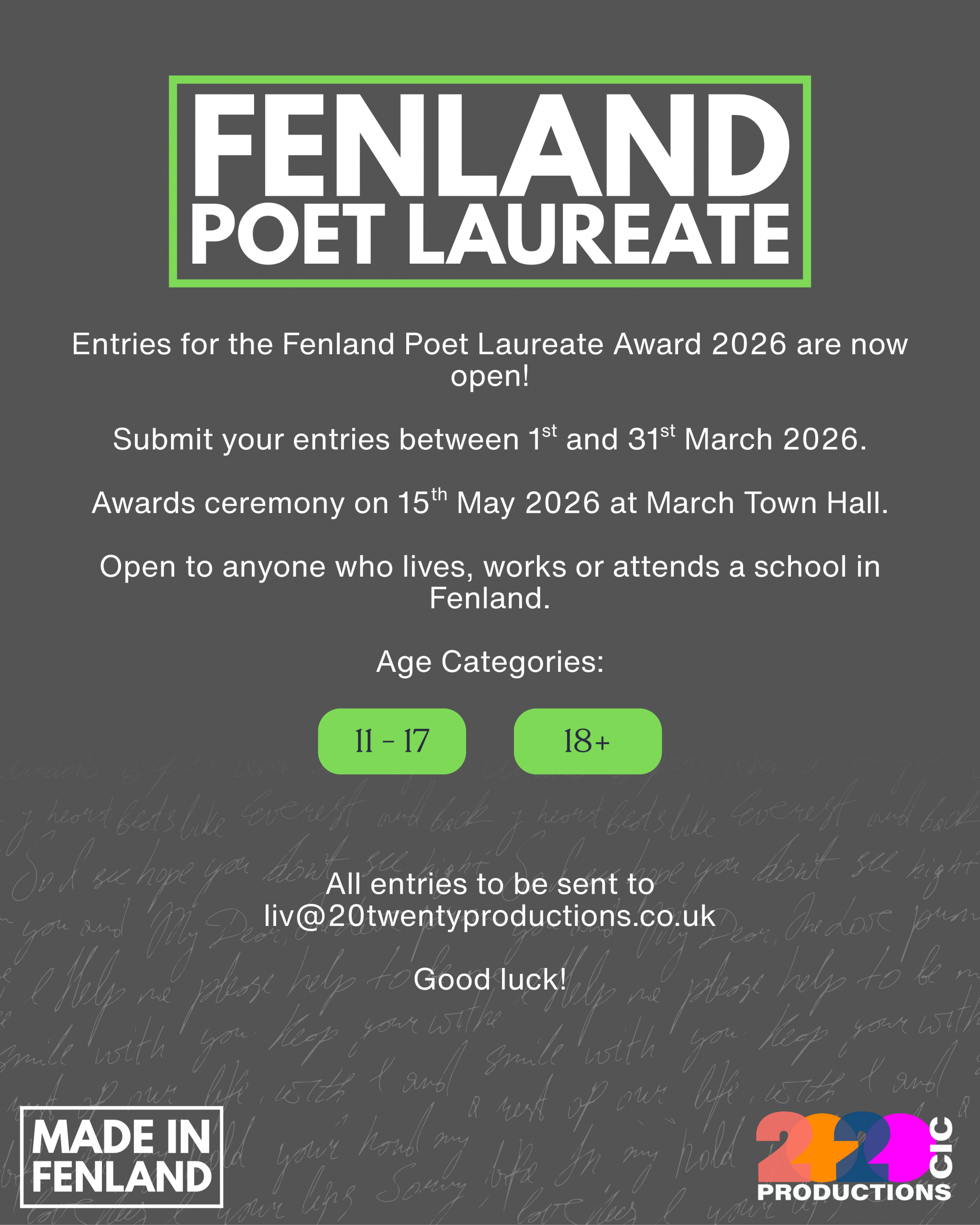 The Fenland Poet-Laureate competition is now open. Entries can be submitted between the 1st and 31st March 2026. It is open to anyone that lives, works or attends a school in Fenland. Click here to find out full details on how to enter and the entry rules.